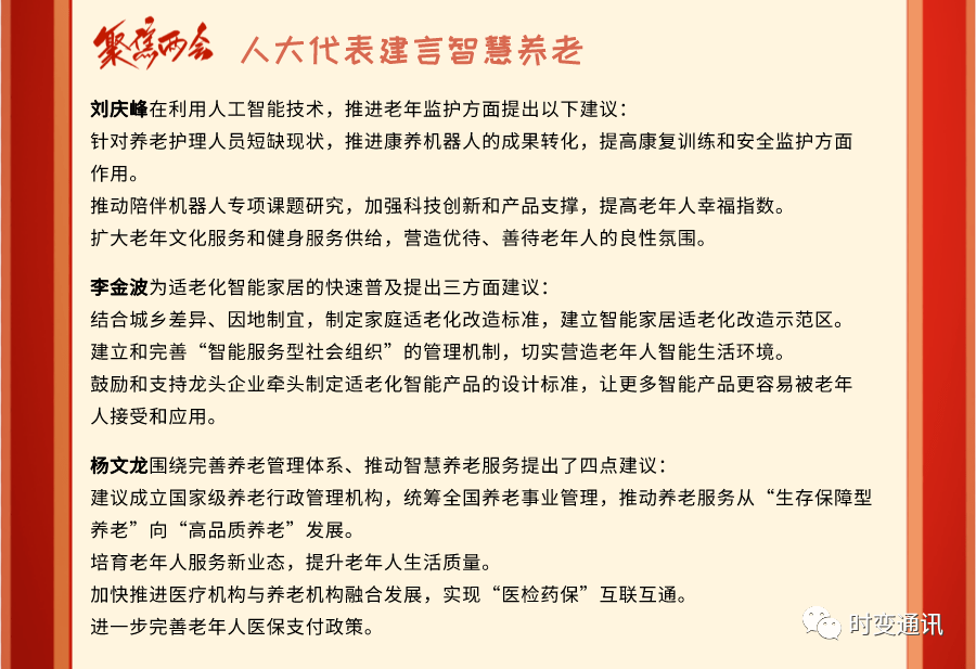 中國已經(jīng)正式進入“老齡社會”,養(yǎng)老問題十分嚴峻,“養(yǎng)老”也成了兩會熱詞。兩會期間,代表們?yōu)橥七M智慧養(yǎng)老服務建設,進行建言獻策。