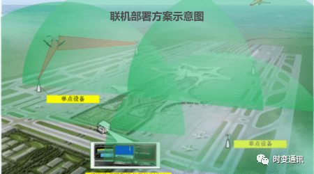 針對機場凈空保護區(qū),時變天幕無人機防御系統(tǒng)的應用采用聯(lián)機部署方案,基本原則是以最低的設備成本覆蓋最大可能的防御范圍。聯(lián)機部署情況下,在后端管理設備和控制中心增加聯(lián)機控制軟硬件設備,實現(xiàn)多套發(fā)現(xiàn)、跟蹤和反制設備的聯(lián)動,以便達到最大的預期防護范圍。時變天幕無人機防御系統(tǒng)也能發(fā)現(xiàn)、識別和跟蹤飛鳥。