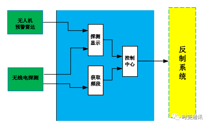 無人機(jī)在空中飛行時,會實時與地面遙控器保持通信,傳輸飛行數(shù)據(jù)和機(jī)上攝像頭拍攝的圖片。時變通訊反無人機(jī)系統(tǒng)通過預(yù)警雷達(dá)探測無人機(jī),無線電探測將無人機(jī)與遙控器的通信信號從復(fù)雜的同頻信號中篩選出來獲取頻率,識別無人機(jī),再聯(lián)動無人機(jī)干擾系統(tǒng),迫使返航或就地迫降。