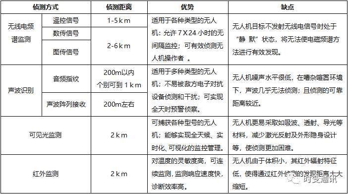 目前主要的無(wú)人機(jī)偵測(cè)手段包括電磁頻譜監(jiān)測(cè)、聲波識(shí)別和可見(jiàn)光偵測(cè)、紅外偵測(cè)等方式。