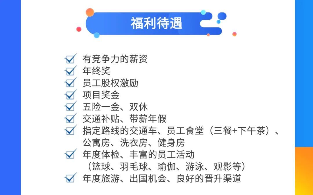 我們不僅周末雙休、帶薪年假,而且工作日三餐下午茶、公寓房、洗衣房公司全包,更重要的是五險(xiǎn)一金、豐厚薪資,各種年終獎(jiǎng)、項(xiàng)目獎(jiǎng)不要太爽。