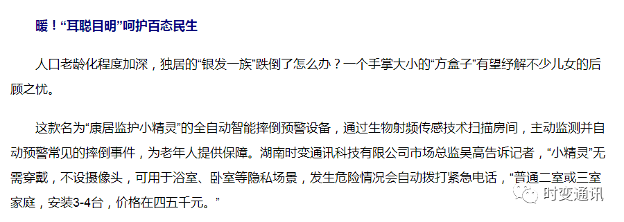 時變通訊一直致力于將全球領(lǐng)先的射頻通訊技術(shù)和深度機器學(xué)習(xí)應(yīng)用于智慧養(yǎng)老行業(yè),為個人養(yǎng)老、社會養(yǎng)老提供全新的一體化解決方案,使養(yǎng)老模式變得多樣化、人性化、高效化,幫助老人實現(xiàn)從被動診療到主動預(yù)測、提前預(yù)警的全新智慧養(yǎng)老模式的完美過渡。