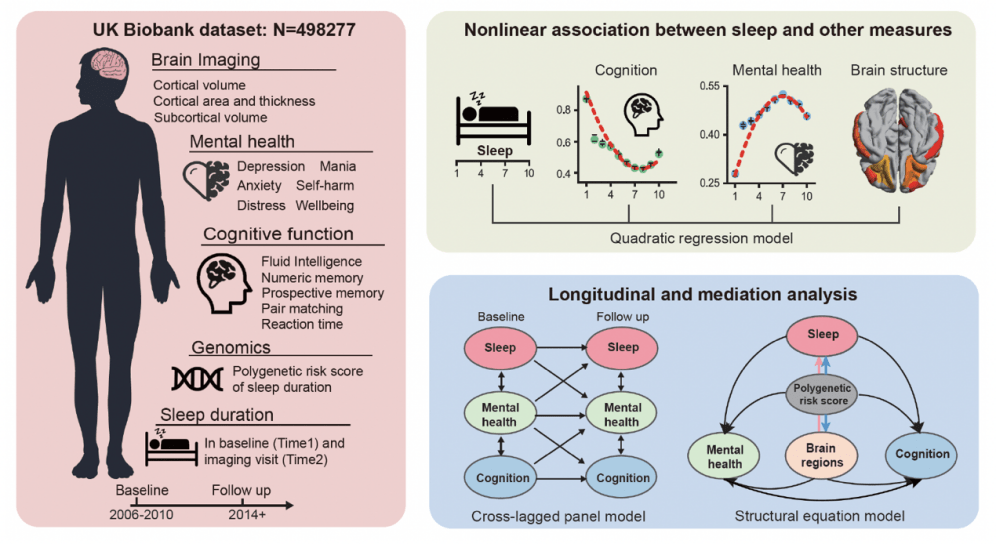 該研究首次系統(tǒng)刻畫(huà)了中老年人睡眠時(shí)長(zhǎng)認(rèn)知功能、精神健康等多維度表型之間的非線(xiàn)性關(guān)系,并發(fā)現(xiàn)該關(guān)系背后的遺傳與神經(jīng)基礎(chǔ),為指導(dǎo)中老年人健康睡眠、促進(jìn)中老年人認(rèn)知與精神健康提供科學(xué)依據(jù)。