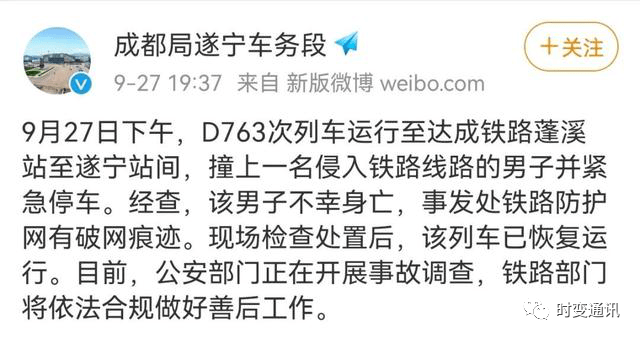 最新官方消息,9月27日晚間,成都局遂寧車務(wù)段發(fā)布消息稱,9月27日下午,D763次列車運(yùn)行至達(dá)成鐵路蓬溪站至遂寧站間,撞上一名侵入鐵路線路的男子并緊急停車。此次鐵路入侵事件造成1人身亡,D763及途經(jīng)該路段的多輛列車晚點(diǎn)。據(jù)消息稱,事發(fā)處鐵路防護(hù)網(wǎng)有破網(wǎng)痕跡。目前,公安部門正在開(kāi)展事故詳細(xì)調(diào)查。